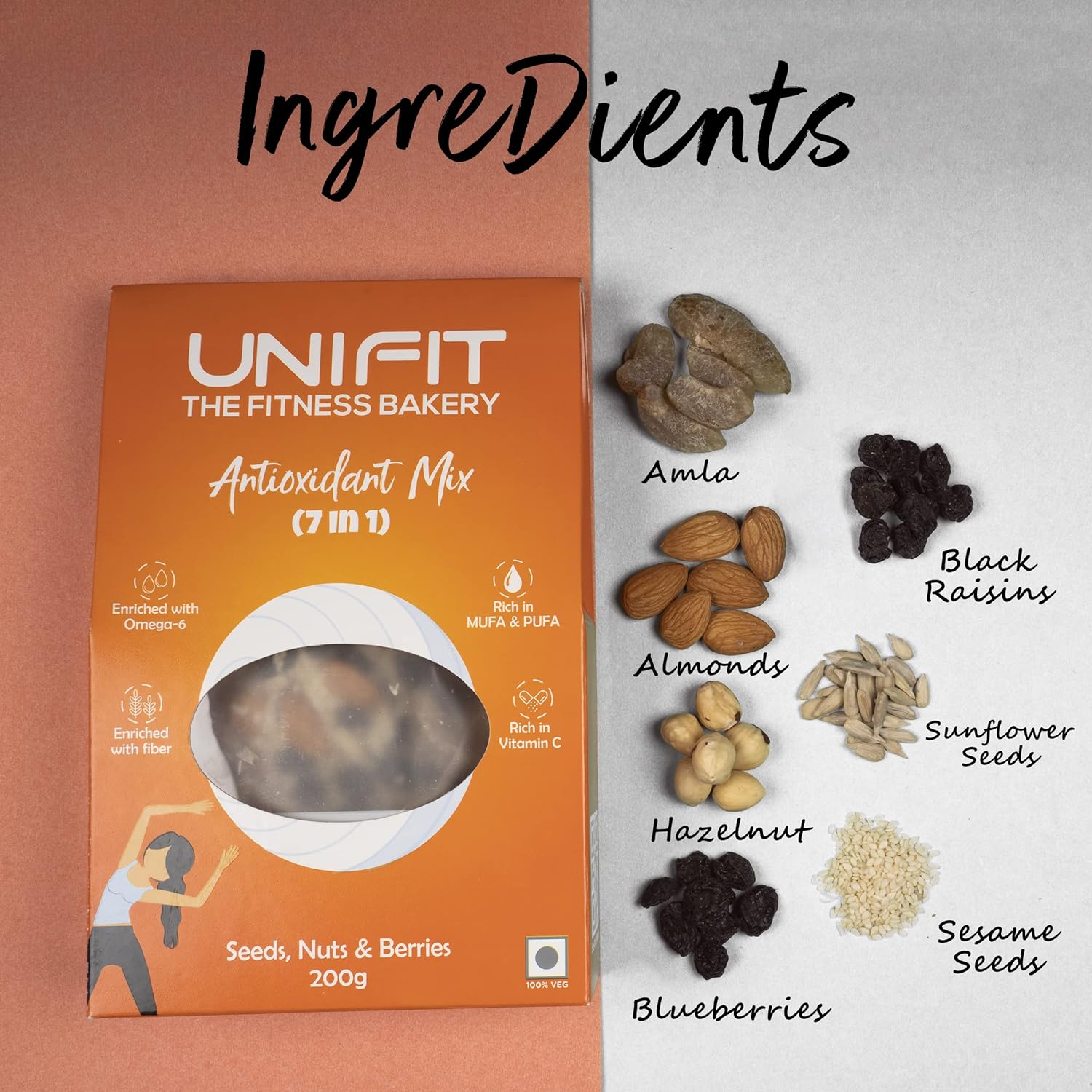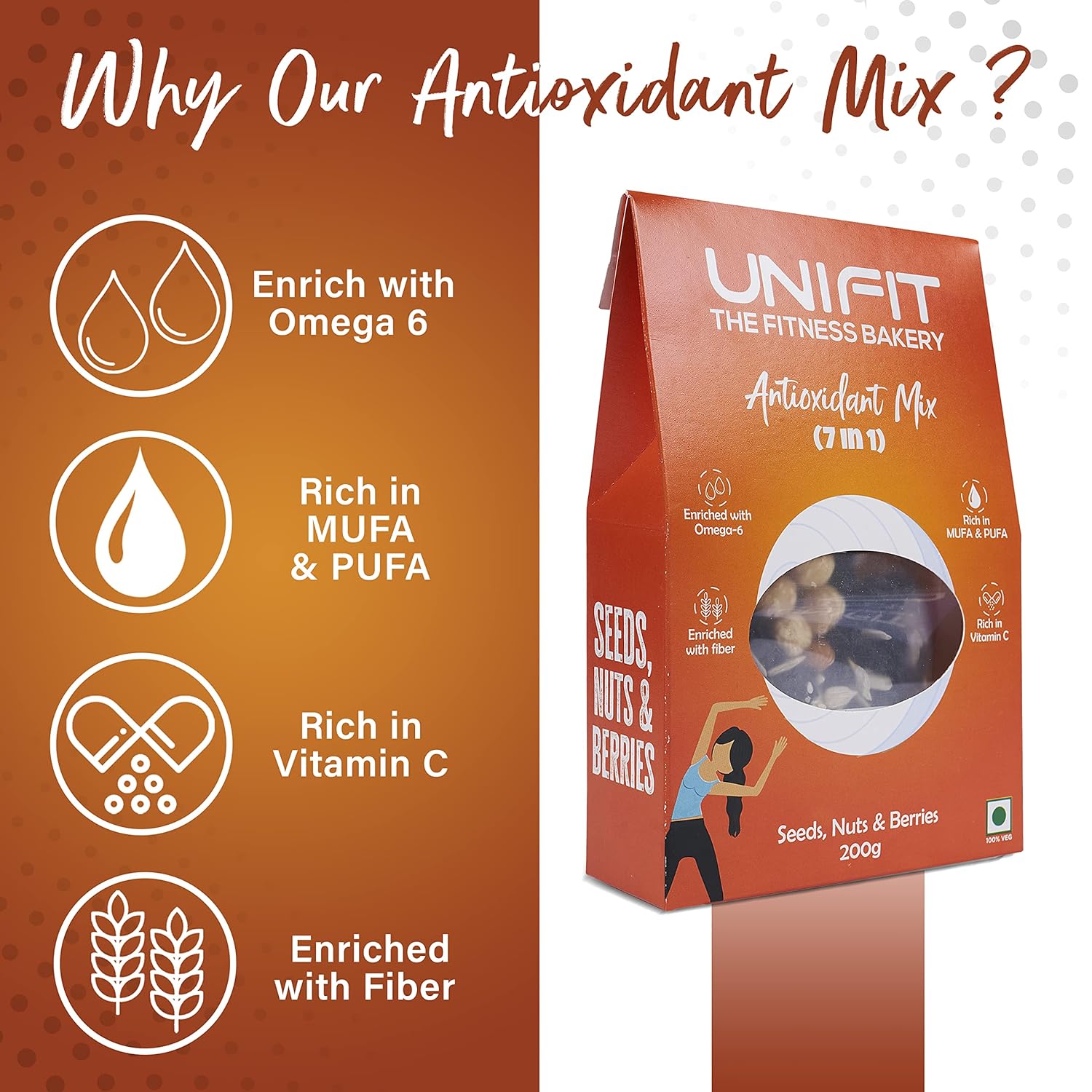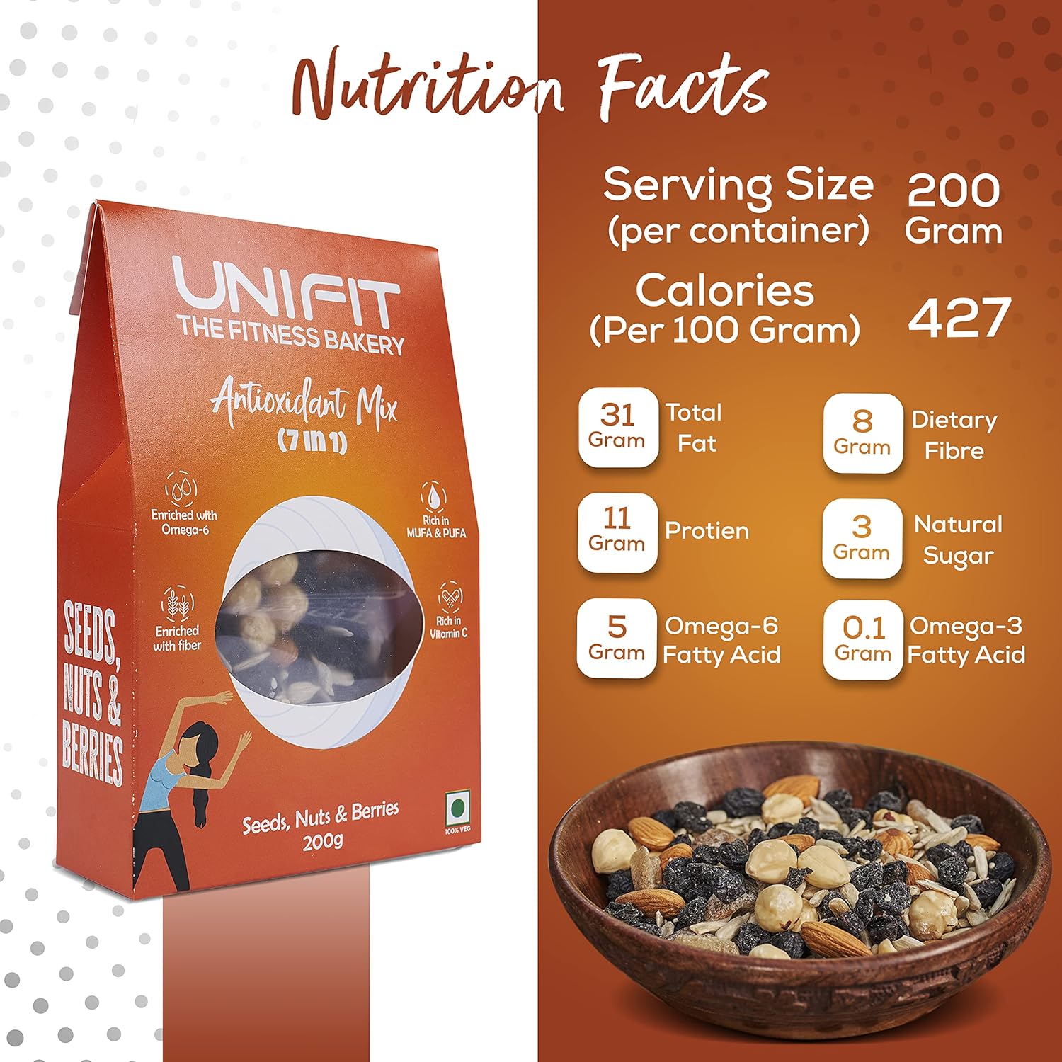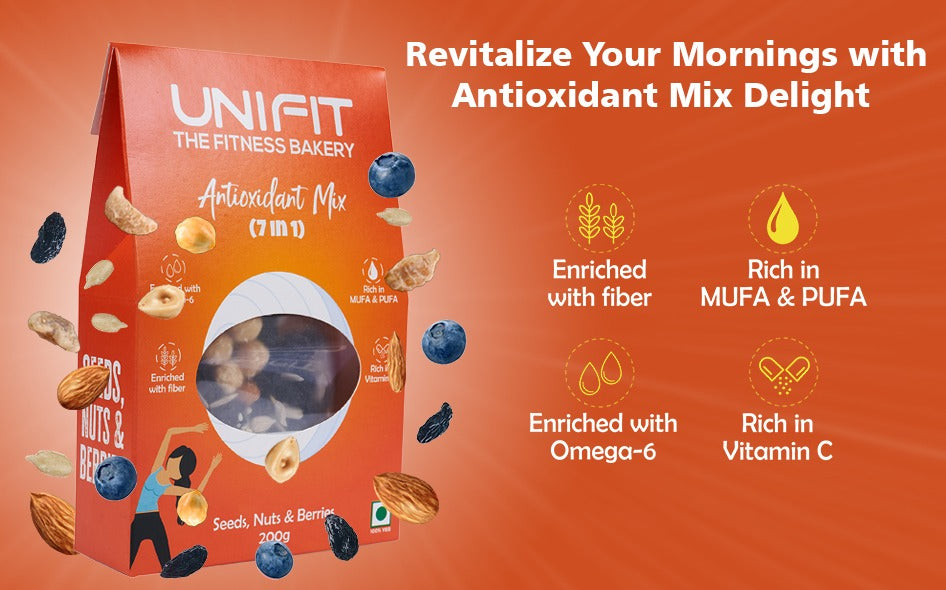 Nuts and Seeds: UNIFIT 7 in 1 Antioxidant Mix offers the benefits of mixed dry fruits and roasted seeds, making it a perfect choice for a hearty and nutritious breakfast.
