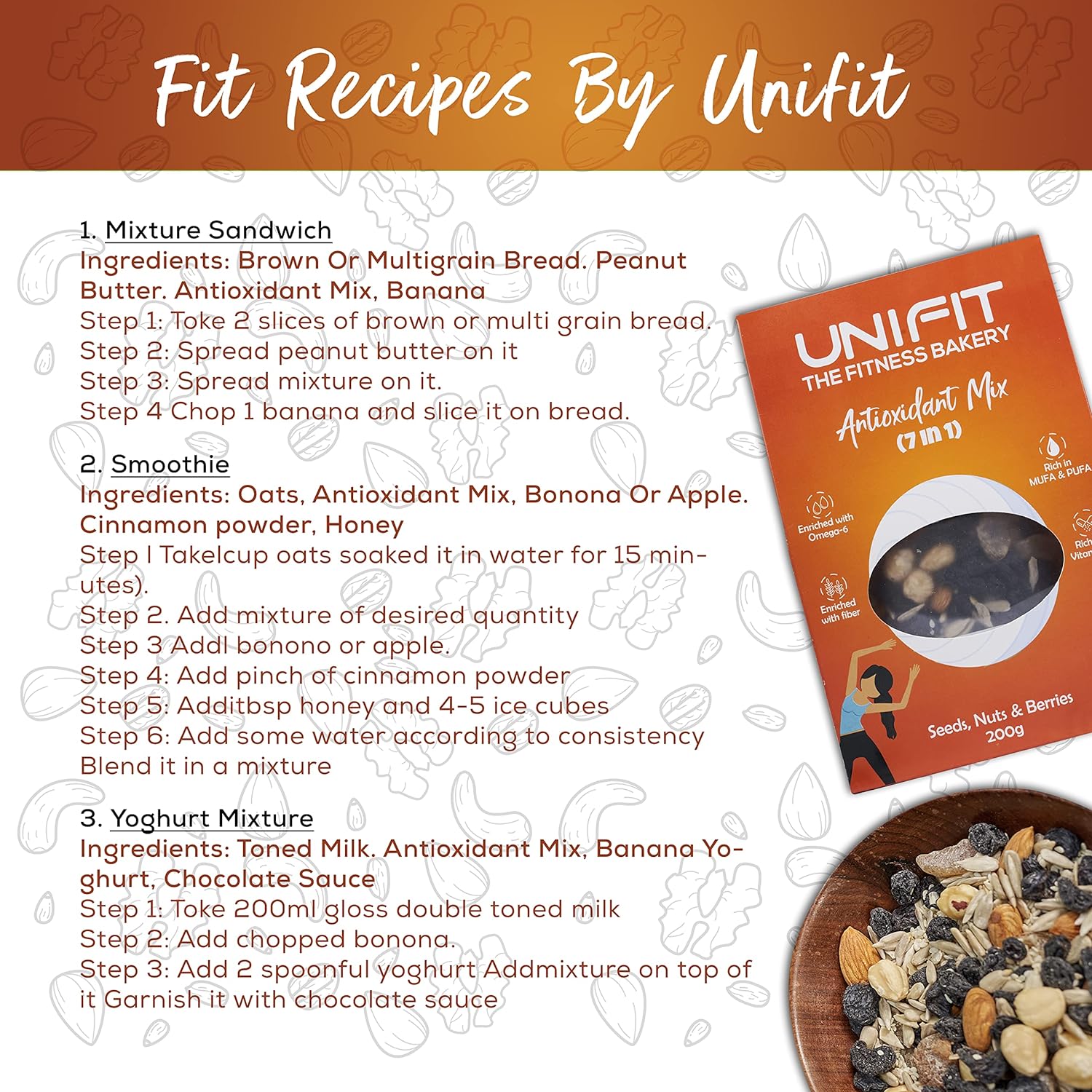 1. 🍞On brown or multigrain bread, spread peanut butter and add Unifit Antioxidant Mix dry fruit mix. Top with sliced banana. Enjoy a nutritious and delicious snack!