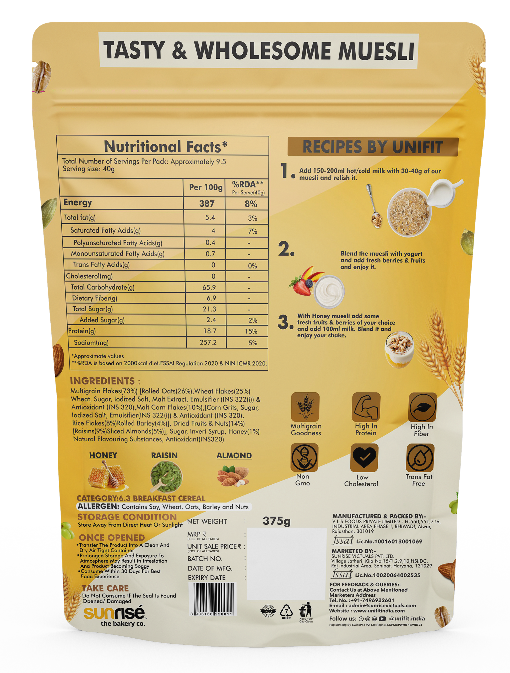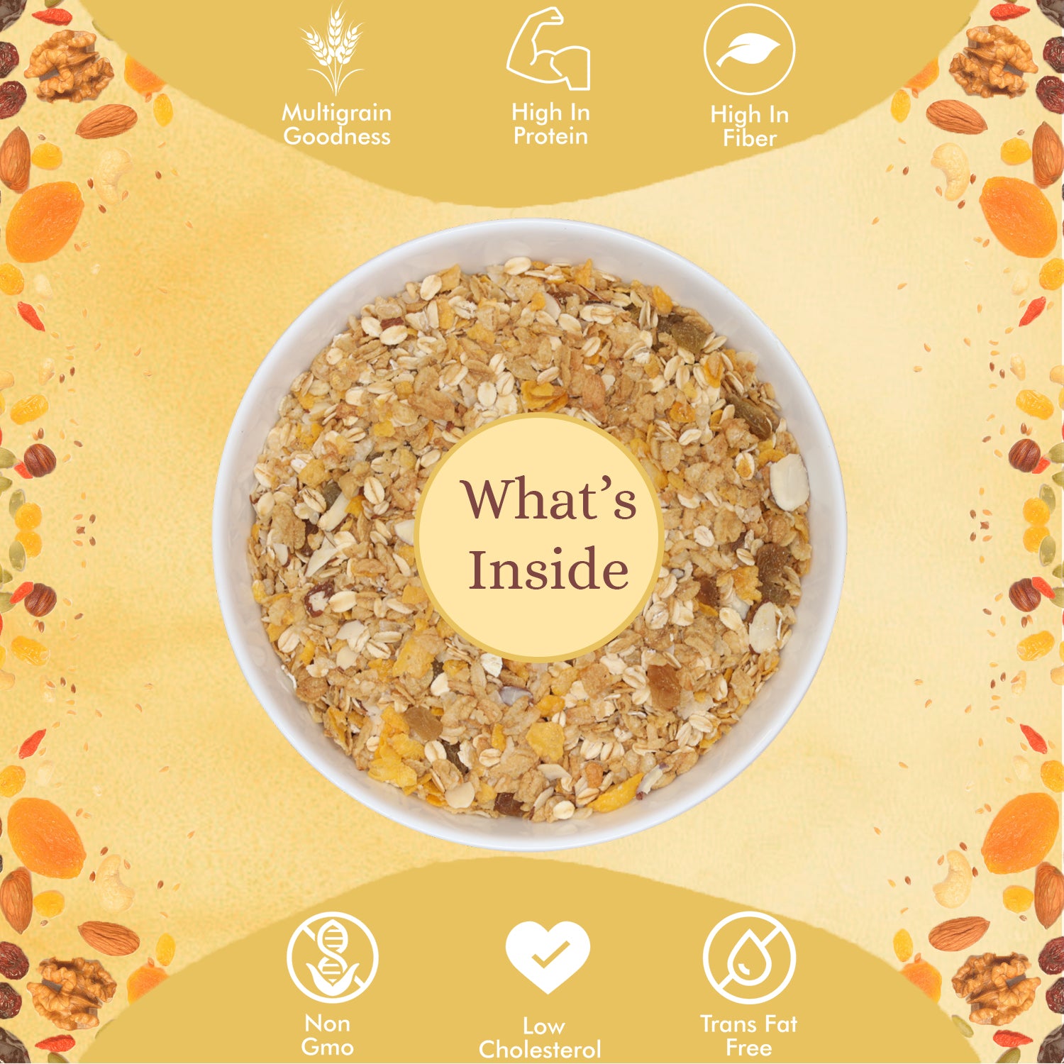 Wholesome Ingredients: Multigrain flakes, honey, raisins, and almonds for a delicious start to your day.