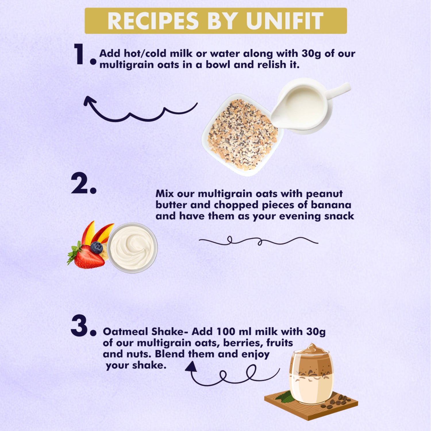 3. 🍹Oatmeal Shake- Add 100 ml milk with 30g of our multigrain oats, berries, fruits and nuts. Blend them and enjoy your shake.